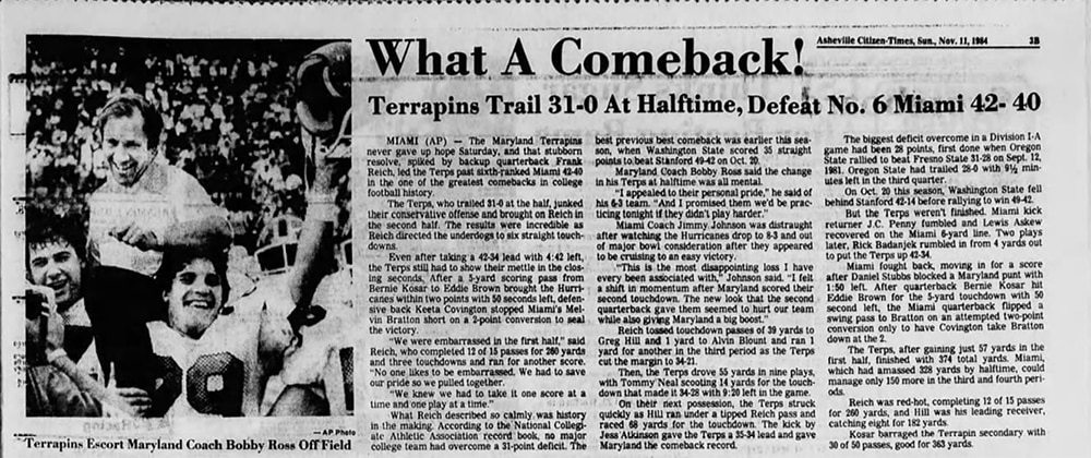 "The Maryland Terrapins never gave up hope Saturday, and that stubborn resolve, spiked by backup quarterback Frank Reich, led the Terps past sixth-ranked Miami 42-40 in one of the greatest comebacks in college football history," reported the AP. "The Terps, who trailed 31-0 at the half, junked their conservative offense and brought on Reich in the second half. The results were incredible as Reich directed the underdogs to six straight touchdowns."